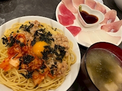 おはよーございます! 蘭です! 本日も12時〜出勤します^^ 昨日の夜ご飯🍚 時間なかったんで簡単に自炊! 納豆キムチパスタで腸活💪 お味噌汁はえのき、オクラ、豆腐 とろろ昆布乗せてます♡ あとこのブリとろとろで美味しすぎた🤤